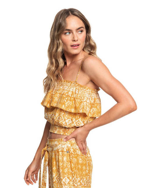 Ruffle tube top with smocked detail.