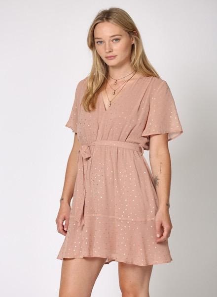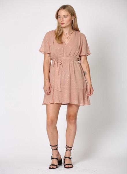 Chiffon short sleeve dress with a belt tie waist. Features a fixed V- neckline and ruffle hem detail.