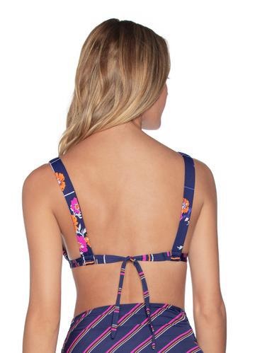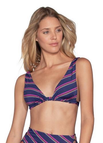 Stripes and floral print combine for a maajical creation. Island Parade is a triangle bikini top perfect for your next tropical getaway. The top front side has multiple stripes while the back boasts a pretty floral print then it reverses to an iconic Maaji print. Wide straps provide an alternate way to wear this back-tie bikini top.