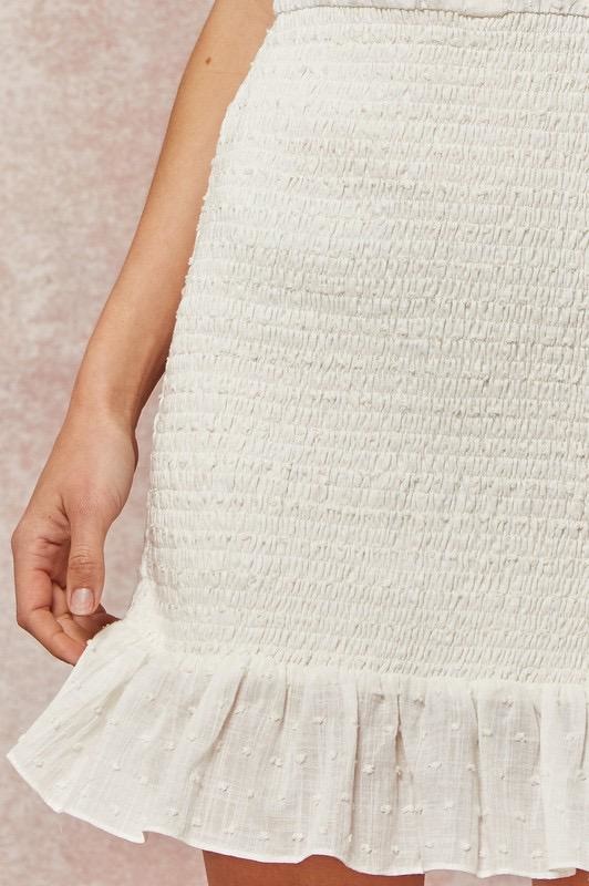 A woven mini dress with the following features: Plaid pattern Swiss dot fabric. Sleeveless. Scoop neckline. Button-front bodice. Smocked skirt. Ruffle hem. Open surplice back. Self-tie back closure 100% Cotton