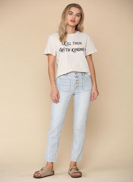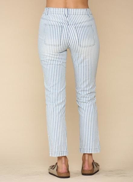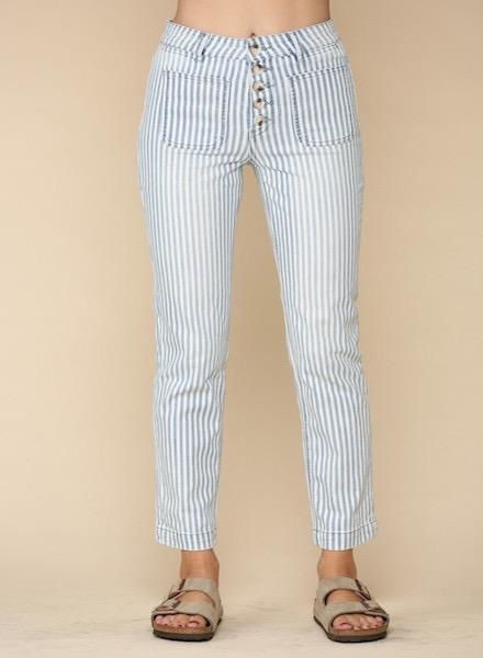 Vertical striped pants with tortise button fly detail, featuring a front pocket detail.