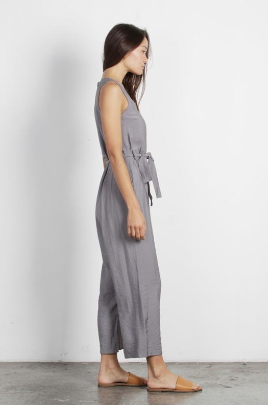 Sleeveless button down jumpsuit with v-neckline with front waist tie detail.