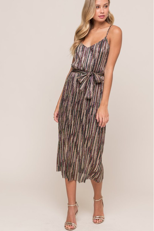 MEtallic plisse belted midi dress with V neckline and a relaxed fit.