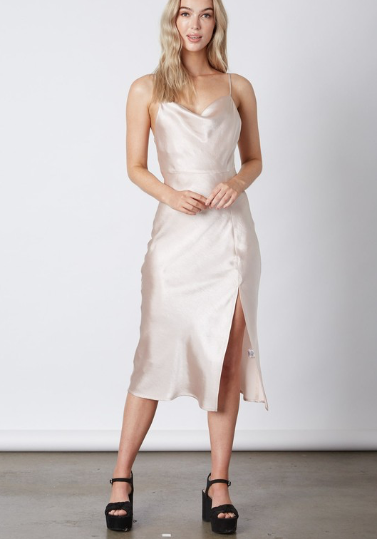 A satin dress featuring a cowl neckline and adjustable came straps.