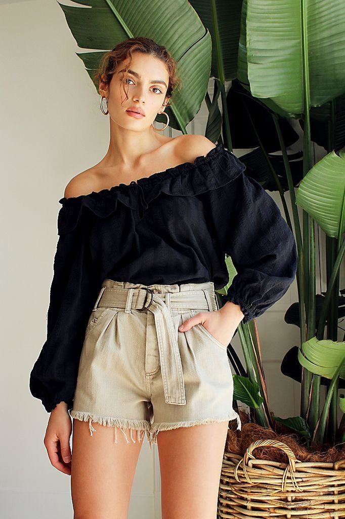 Retro-inspired shorts from We The Free collection featuring raw bottom hem and paperbag waist with tie for added shape. Button-front closure Five-pocket design Soft denim fabrication