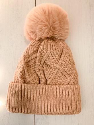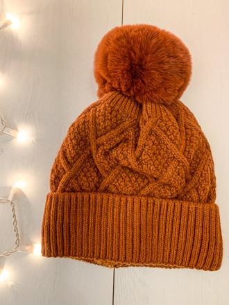 Warm up from your head to toes in this chunky handknit beanie featuring an oversized pompom on top with a fleece lining.